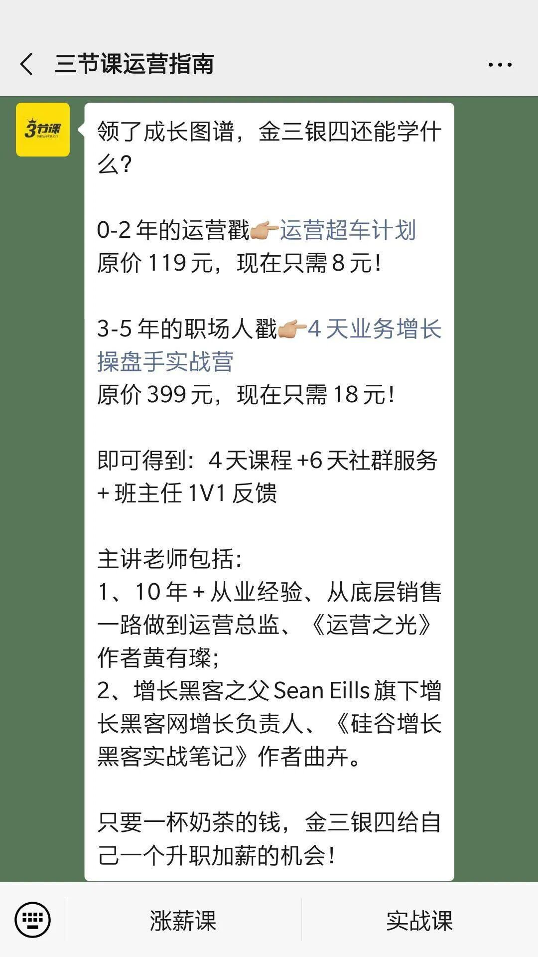 简单分析一下触达内容——主要推的是8元的运营超车计划与18元的业务增长操盘手实战营这两门引流课,我认为发这一条就够了,写的还是蛮不错的。大家有兴趣的话可以自行去品一品,这里就不展开分析了,应该都是磨了很多次的文案,转化文案这方面向来可都是三节课的强项。