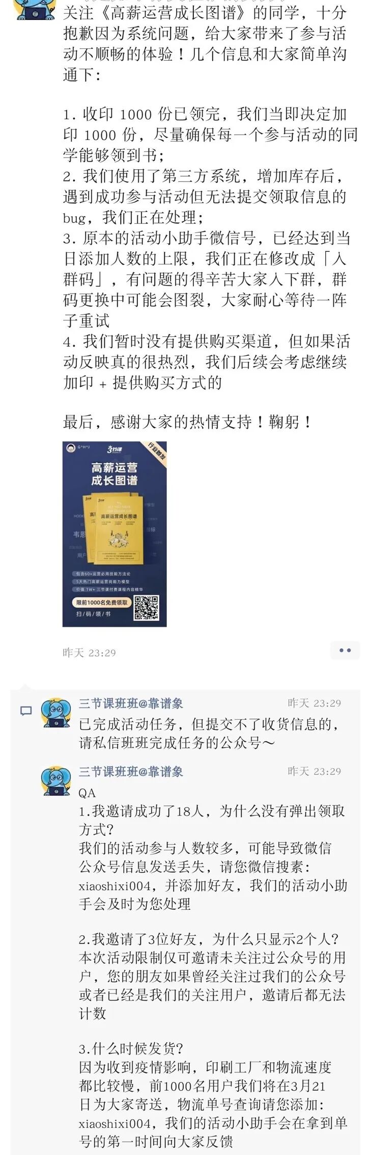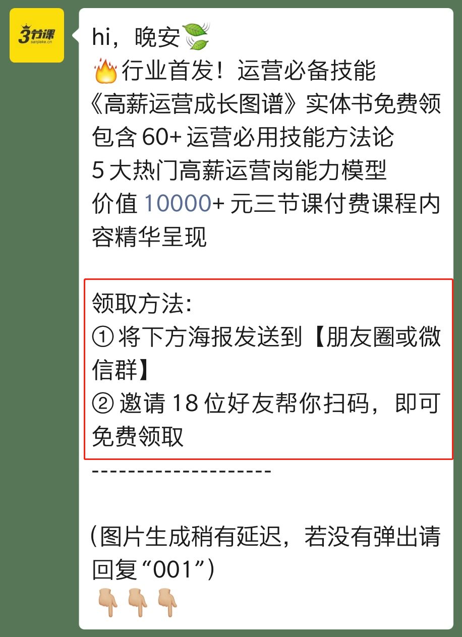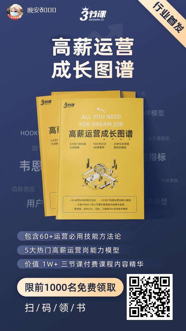 刷屏主角是“三节课”官方发布的一篇文章《我们做了一本书,就1000份,错过会哭》,目的为运营人群提供一份《高薪运营成长图谱》,最开始是1000份,后面紧急改变成5000份,也是三节课为自己做的一次增长裂变活动。