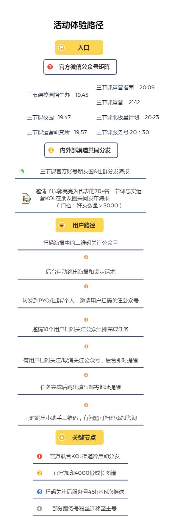 先前的这四次活动为各矩阵的服务号首先是做足了 用户数量的积累 ,其次也有试水的动机,通过这四次的尝试性活动作为MVP来 测试这次增长图谱活动的可行性,并根据数据及时调整裂变策略,最重要的一点是 不断强化大家对于三节课的品牌认知,即在特定时间点,通过公益行为吸引用户注意力,这是走的最长远的一步。